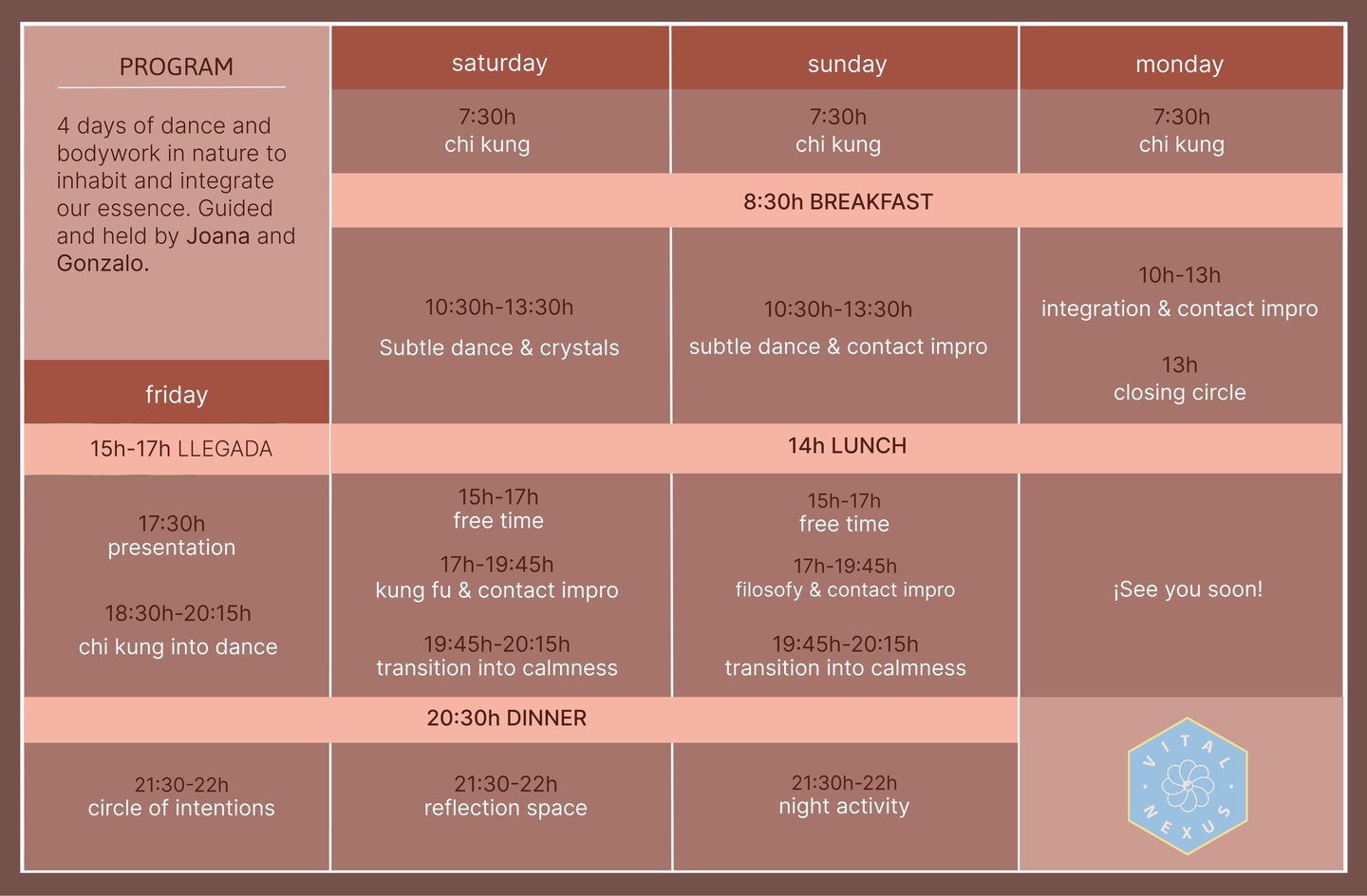 Once you have made the reservation, send the payment receipt with your name to (+34) 600 915 832 or info@vitalnexus.net.
