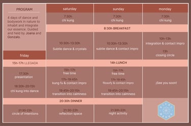 Contact Improvisation: Contact Improvisation will be the fertile and practical ground where we integrate everything experienced throughout the retreat. It is a relational dance technique. There are no predefined roles and nothing to achieve. It is an invitation to live, to be, feel, and exist in interconnection with the whole. Autonomy, self-care, and the ability to make decisions while everything is unfolding in continuity are among the qualities that flourish through this practice. We will work on group awareness and the coexistence between independence and interdependence. We will seek to soften the fear of the unknown by nurturing trust in our natural creative, responsive, and sensory power.