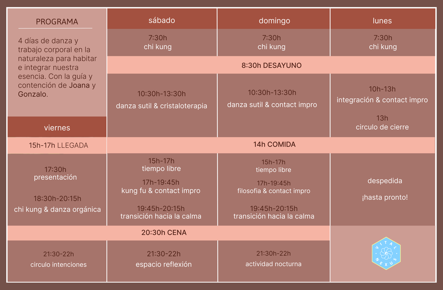 Al haber realizado la reserva envía al (+34)600915832 o a info@vitalnexus.net el comprobante del mismo con tu nombre.