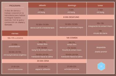El programa propone prácticas cuyos objetivos serán profundizar en nuestra sensibilidad y conexión interna, y otras en donde el objetivo será cultivar el juego y la expresión compartida. Haremos del movimiento, la presencia y el ser una co-creación colectiva, favoreciendo la conexión con las demás, la integración al entorno y el disfrute del momento presente.