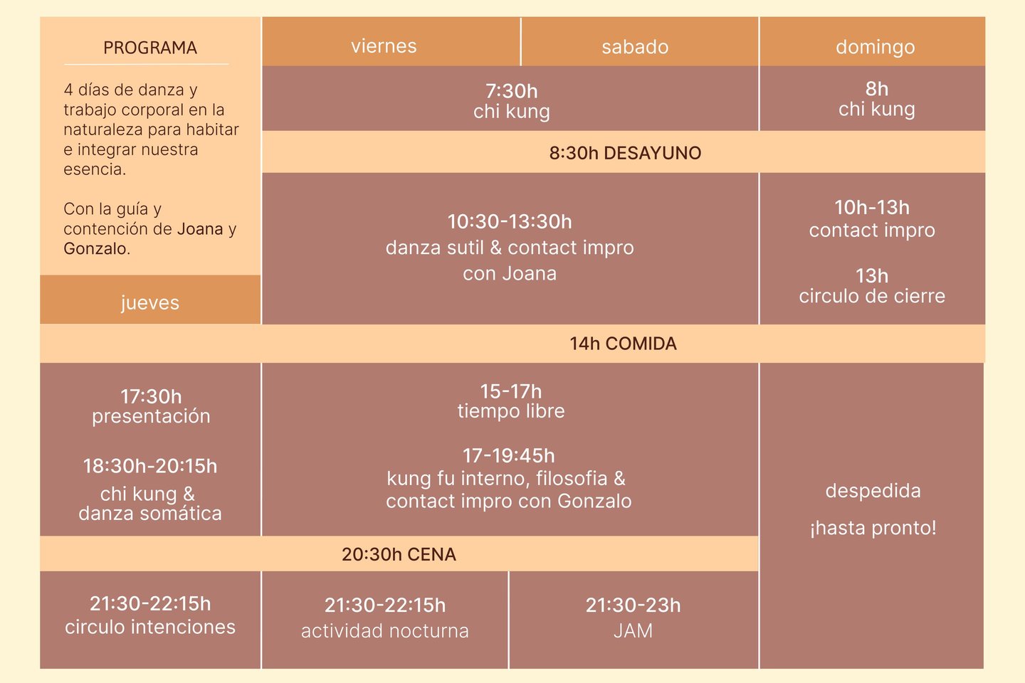 El programa propone prácticas cuyos objetivos serán profundizar en nuestra sensibilidad y conexión interna, y otras en donde el objetivo será cultivar el juego y la expresión compartida. Haremos del movimiento, la presencia y el ser una co-creación colectiva, favoreciendo la conexión con las demás, la integración al entorno y el disfrute del momento presente.