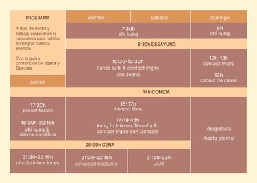 A lo largo de 4 días, nos sumergiremos en un espacio de reflexión y conexión, donde habitaremos prácticas corporales diseñadas para favorecer el autoconocimiento, liberar tensiones y expandir nuestra energía creativa.